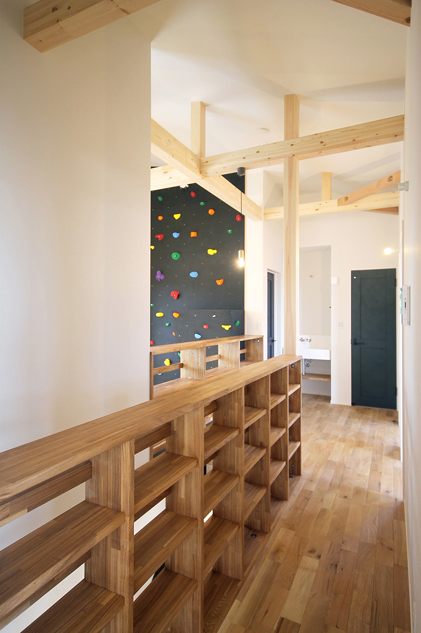ご主人のご趣味やトレーニングが思う存分室内でできるように、壁にはロッククライミング、天井にはうんていを設置した。ロフト収納に上るカラフルなスチールはしごや花火を楽しめる屋上バルコニーなど楽しい仕掛けがいっぱいの家。