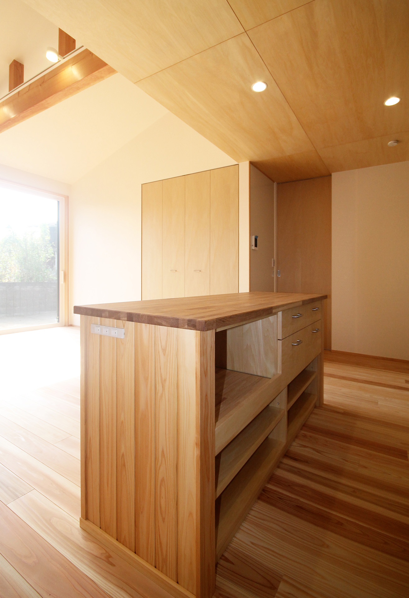 勾配天井の開放的なリビングは庭に向かい光がたくさん差し込み、心地よい空間となりました。